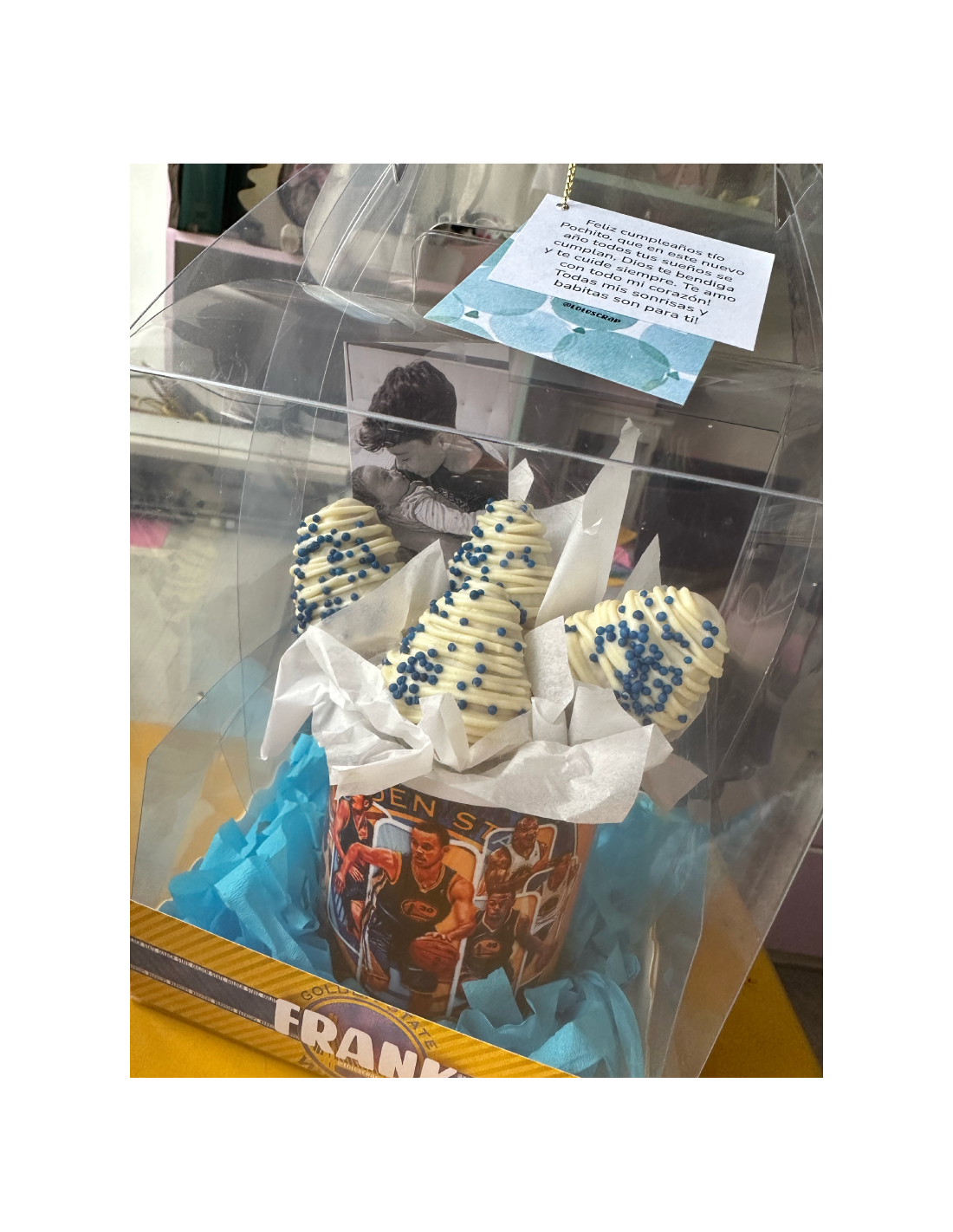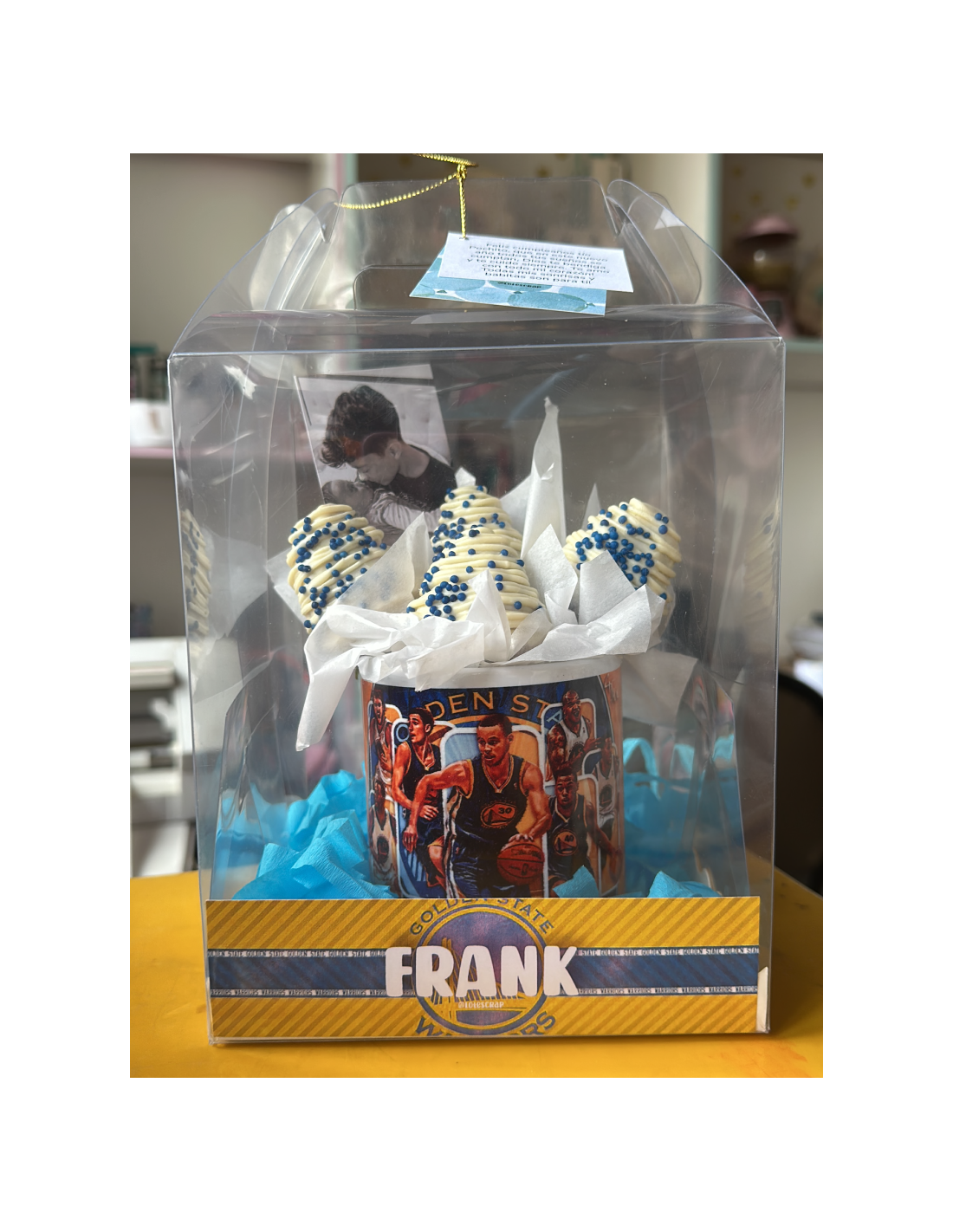 Taza personalizada al 100% con deliciosas fresas con chocolate + cajita personalizada.