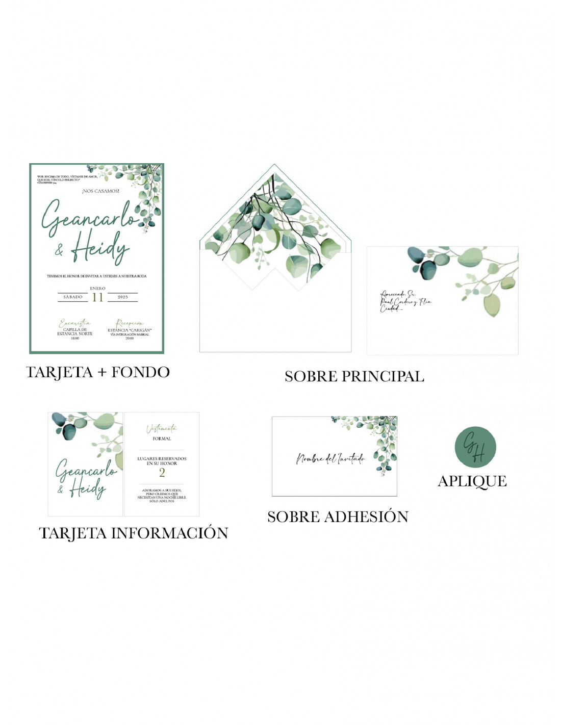 - Sobre principal + impresión interna + Impresión de aplique + Nombre del invitado